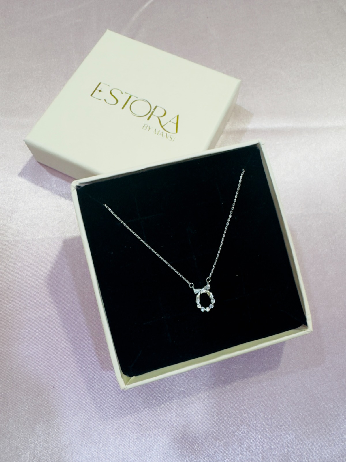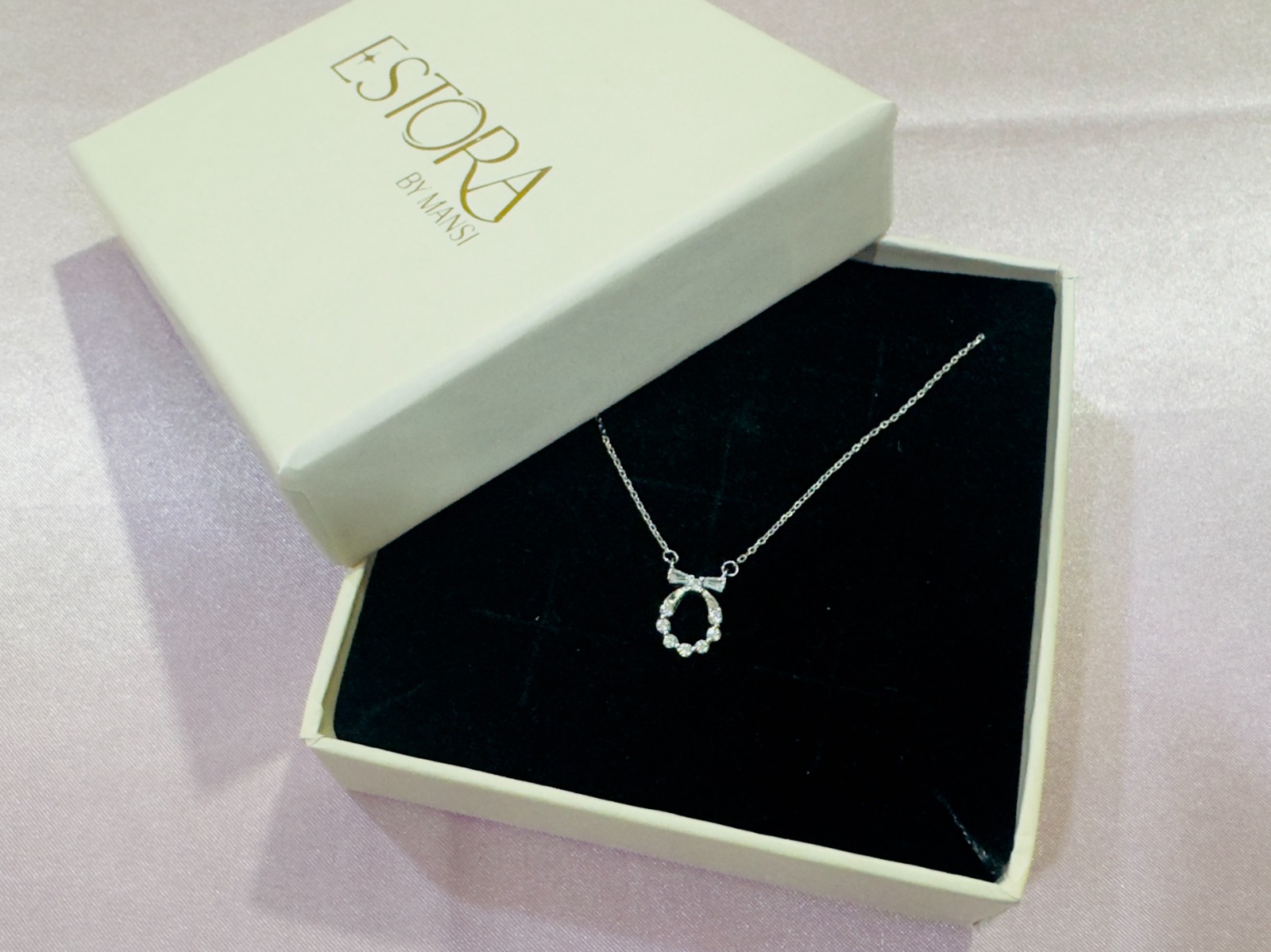 A graceful Korean Bow pendant in pure 925 silver, encrusted with shimmering stones and suspended on a fine chain. Nestled in a black velvet box with gold branding — perfect for gifting.