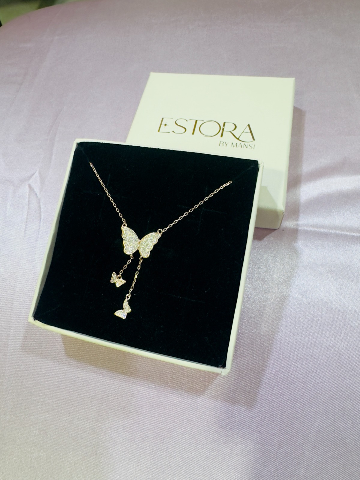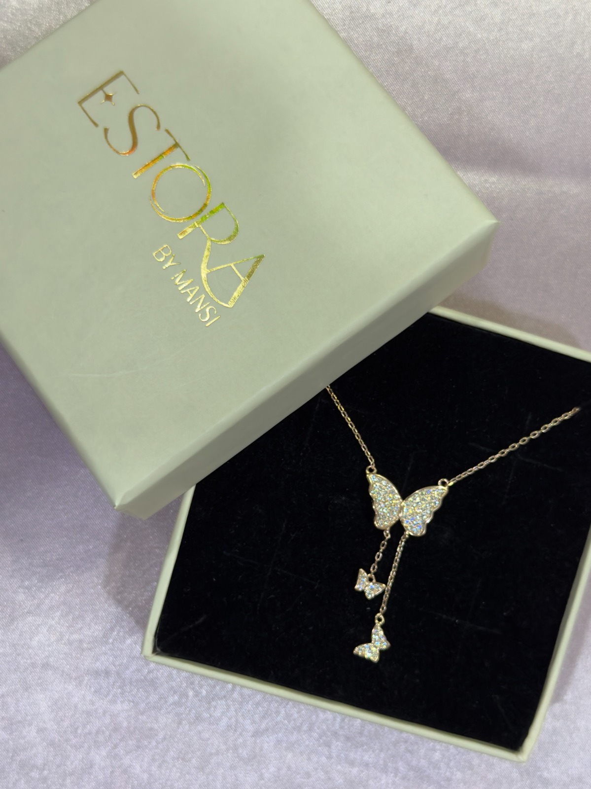 A whimsical trio of butterflies in pure 925 silver, delicately encrusted with shimmering stones. Suspended on fine chains and nestled in a white velvet box with black lining — perfect for gifting.