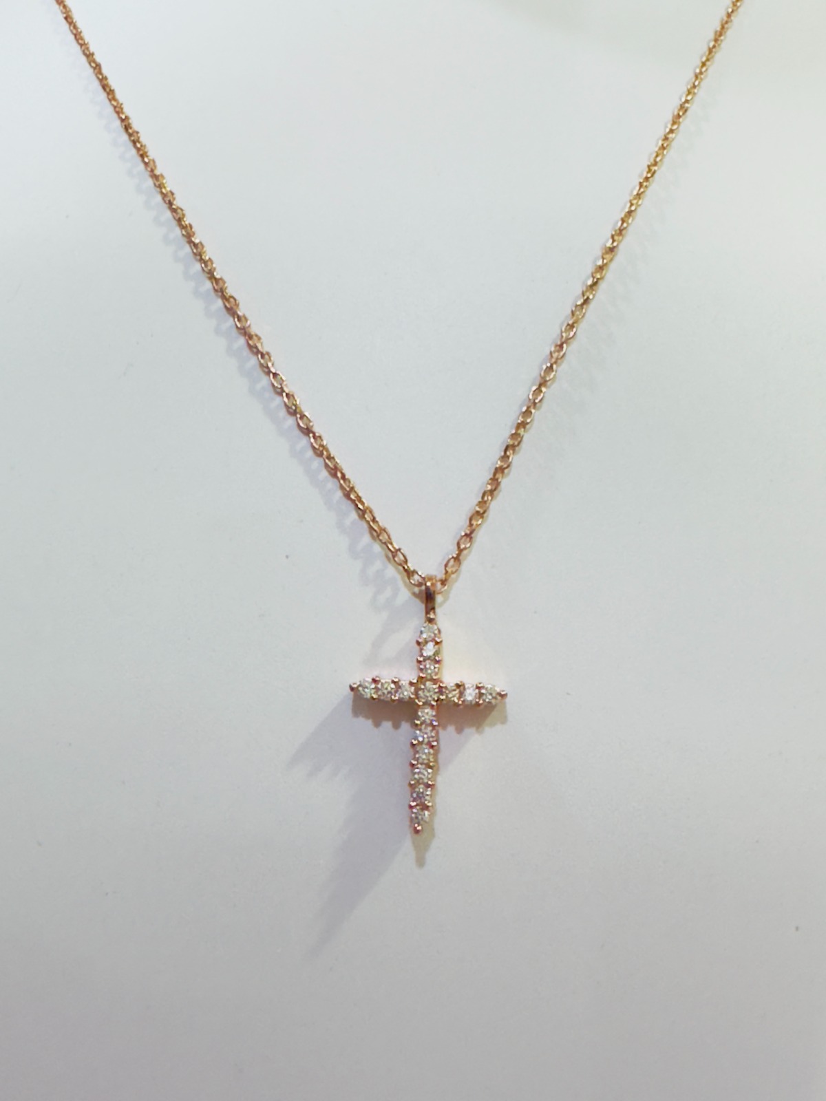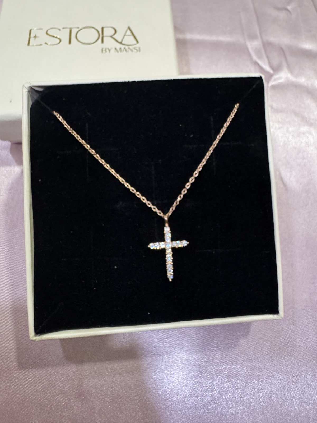 A radiant cross-shaped pendant adorned with shimmering stones, crafted in pure 925 silver and finished in a warm gold tone. Suspended on a delicate chain.