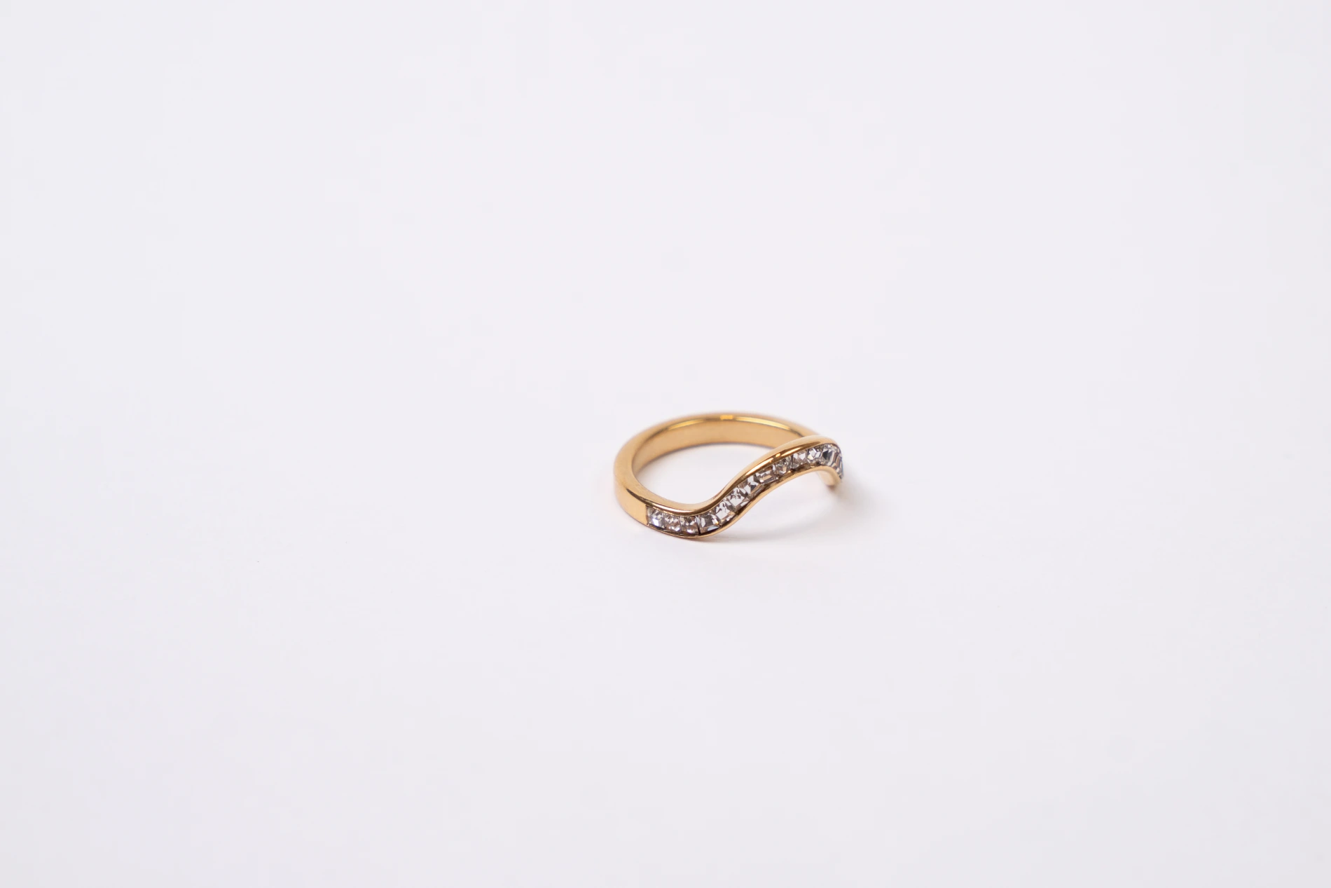 Elegantly adorned with a wavy row of sparkling crystals, this anti tarnish, hypo-allergenic gold band is designed for her who appreciates gentle glamour. The fluid shape symbolizes grace, making it perfect for both everyday styling and diva moments. Skin safe and tarnish-resistant for lasting brilliance.